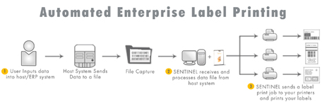 Sentinel打印管理軟件把從ERP等主機系統傳送過來的數據合并到Codesoft標簽設計軟件中,不需要復雜和昂貴的系統應用修改。